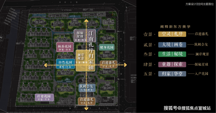 以江南人文精神为源点,打造两轴一环五进空间,江南礼序归家轴串联启迎盛礼、筑阙会友、归家华堂等5重礼制,尊崇归家;健康运动轴以24小时跑道为社区活力生活环,串联儿童乐园、长者康养、疗愈花园等10大生活场景,营造全龄全时的江南诗意生活