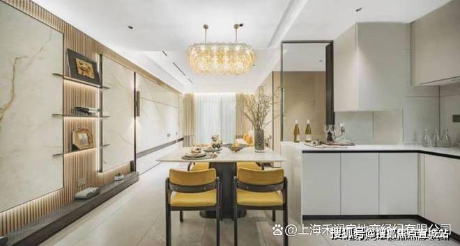一楼电梯厅墙面铺设大面积岩板,吊顶也颇具设计感。
