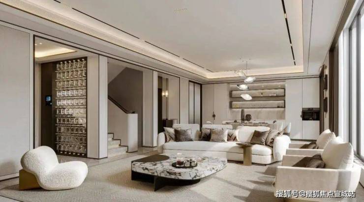 一层是会客区, 约10.7米的超大面宽 ,阳光、空气可以“肆意”穿过,室内通透明亮。