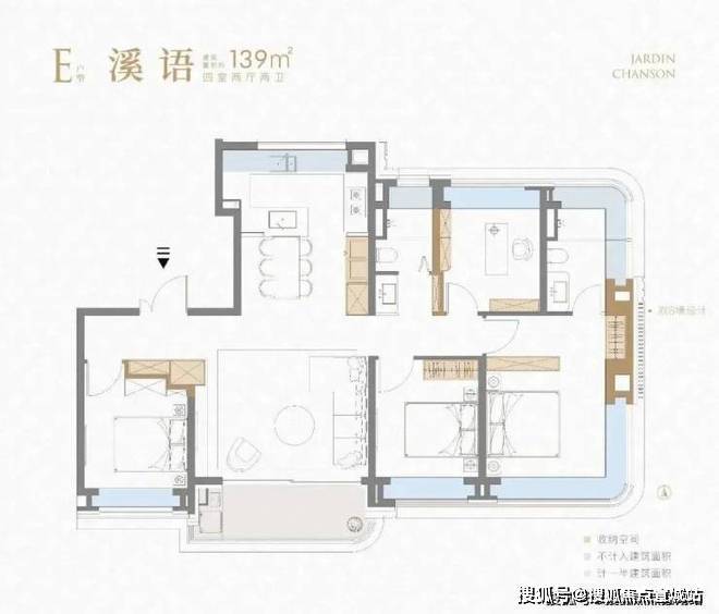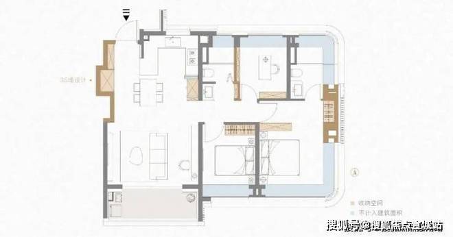 这个户型有独立电梯入户,保障私密性的同时,还多了一个独立都电梯厅,相当于多了一个小厅,可以用来规划摆放收纳柜,变相提高了“得房率”