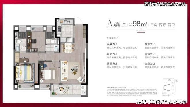 深业·深安上居官方售楼处预约热线:400-8862-334该户型在88㎡户型的基础上,将尺度进行了升级,双卫设计,三开间朝南+动静分离,室内采光面非常大,通透明亮。