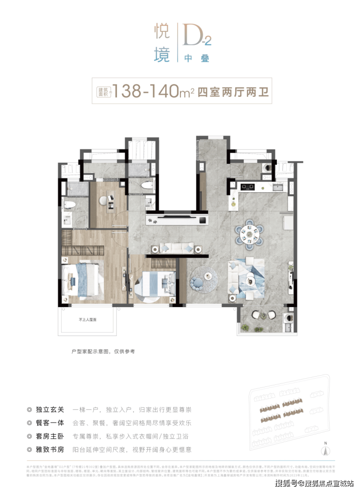 建面约 142m² 上叠,既实现了不同平层与普通高层的墅质体验,又简化传统别墅的复杂动线,以及频繁走动带来的不变,利用了空间,更能够科学地进行功能分区。
