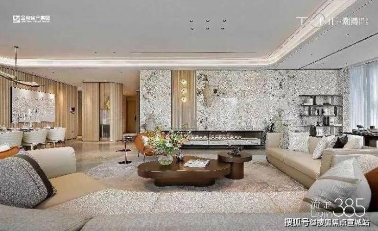 东区建面约320户型,将艺术感进一步融入日常中。特别设计的专属门厅空间,是从电梯厅延伸到家,如同一处艺廊,放慢人的情绪;室内选用了浅金色奢石(外界也称其为“芬迪白大理石”)作为主要的石材,曲面的木饰面也为浅色,整体给人以明亮感。