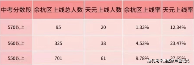 去年,天元公学初中部共有162名学生参加中考(余杭区考生7168人),虽然总考生比例仅占余杭总考生的2.2%,但是580分以上的人数却占比达23.1%,其他各高分数段也是遥遥领先。