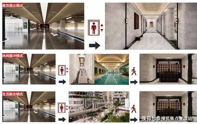 休闲缓冲模式(车库→会所→园林→单元大堂→归家),先于会所健身、游泳等,实现“压力释放-归家”的场景过渡。