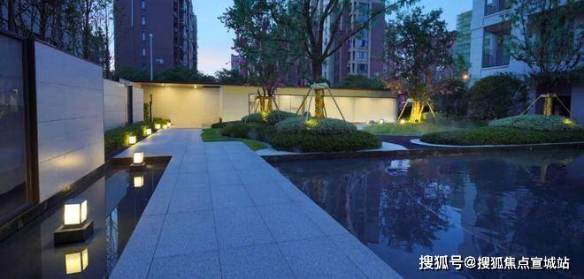 规则的绿植、层叠的水景营造入口空间体块感的同时也消除了门廊和围墙的生硬感,结合灯光、小品,为空间注入一抹灵动与温暖。