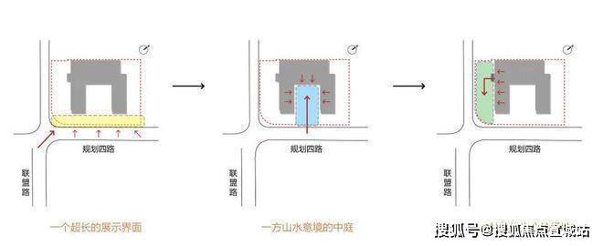 由于售楼处选址是将来住区配套幼儿园,是典型的围合式院落校园建筑,建筑朝向街道的界面是楼梯连廊等次要交通空间,立面效果欠佳。景观沿道路打造一个门廊空间来展示项目形象。
