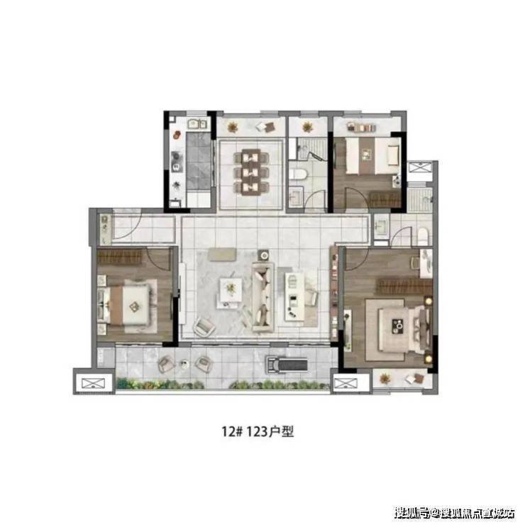 123平的户型,是3+1房2厅2卫,3.5m面宽户型设计,全明通透,通风采光良好,空间户型方正,空间利用率高。