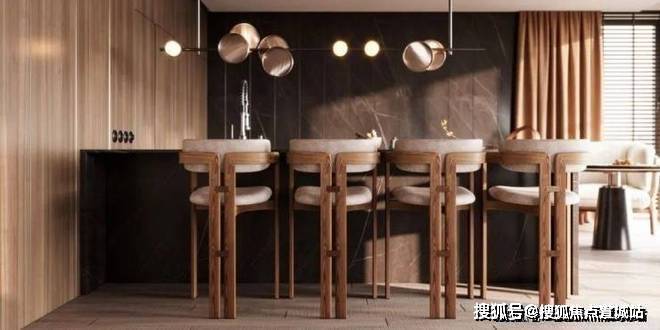 木色的层次充盈了整个空间属性,餐桌的吊灯别具特色,错落有致,与室内的设计格调相呼应,餐凳呈T字形,造型别致的同时又具有实用感。