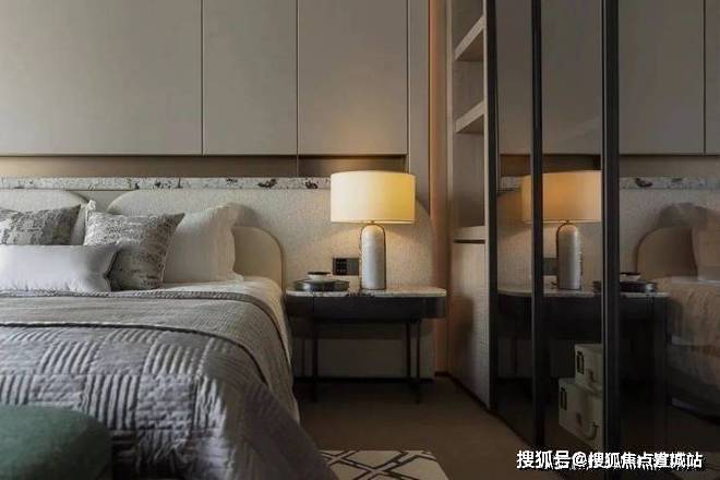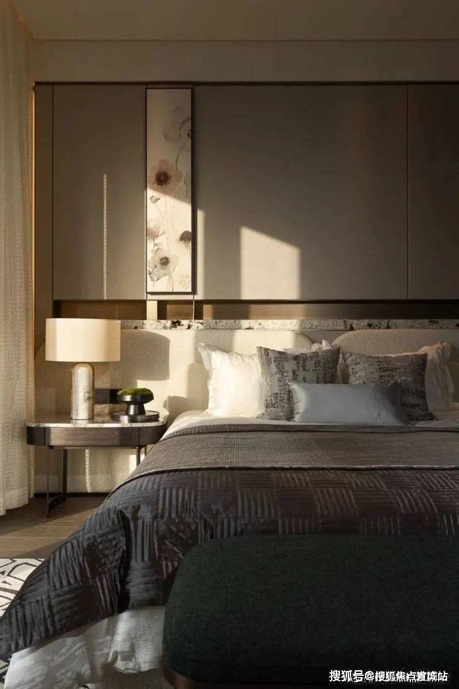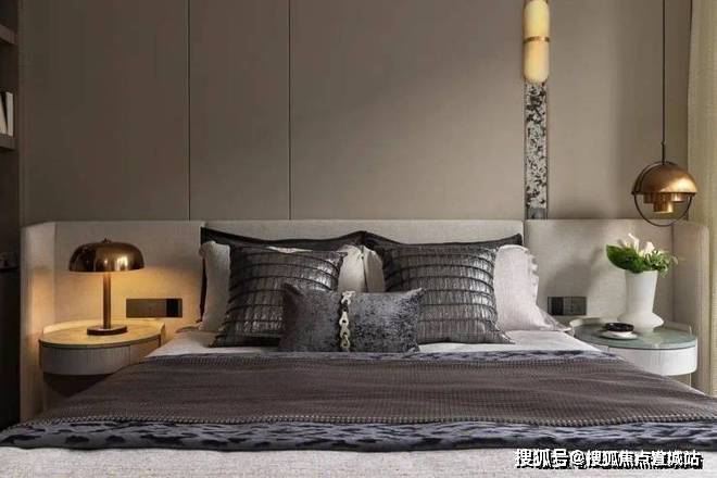 主卧室大气、质感,用简单的造型背景墙和圆形灯就渲染出了卧室的调性,仅用灰色和棕色便提升了空间的精致感。设计师钟爱用线条来映衬出空间的动静感。