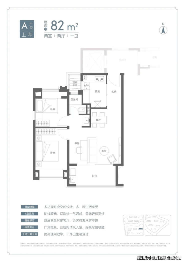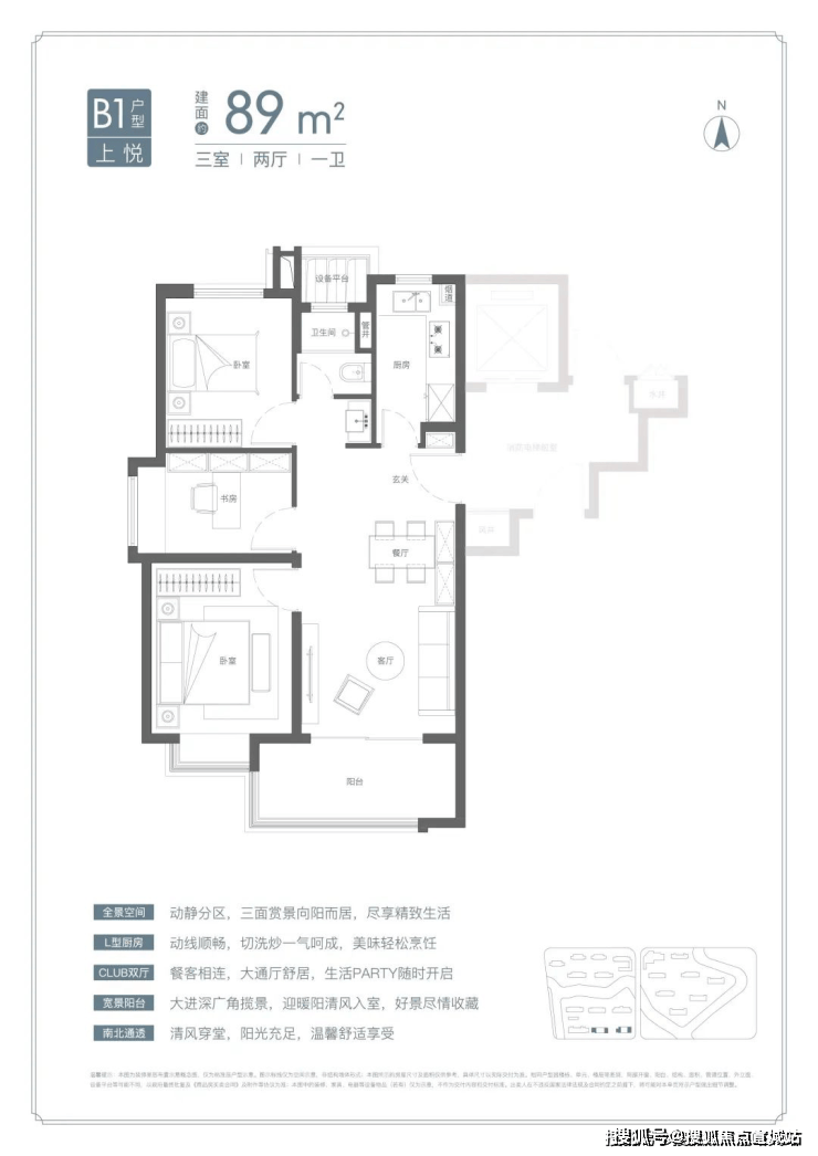 U型厨房、餐厅、客厅、阳台一线联通,南北通透。主卧套房、全卧飘窗、次卫干湿分离也都是标配。