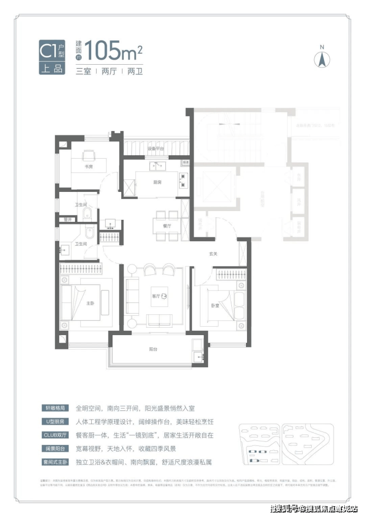 罕见宽厅设计:约95%的宽厅设计出现在120㎡以上户型中,而项目在约105㎡面积段就做了宽厅,非常难得,这个户型进入二手房市场将极具竞争力。