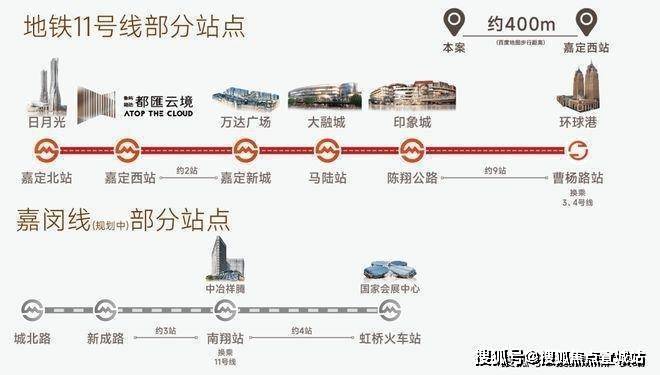嘉定练祁佳城云汇售楼处电话/地址:400-8851-337【营销中心预约☎】项目距离11号线嘉定西站直距约400米(百度步行距离),乘坐11号线可直达曹杨路环球港、徐家汇等地标商圈;也可在南翔站换乘嘉闵线(在建中)直达大虹桥。