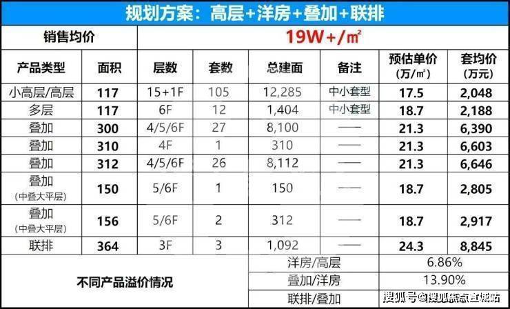 据项目最新流出的产品规划及定价方案:项目整体采用“高低配”方案,产品包括洋房、高层、叠加、联排,未来售价可能在20w+!