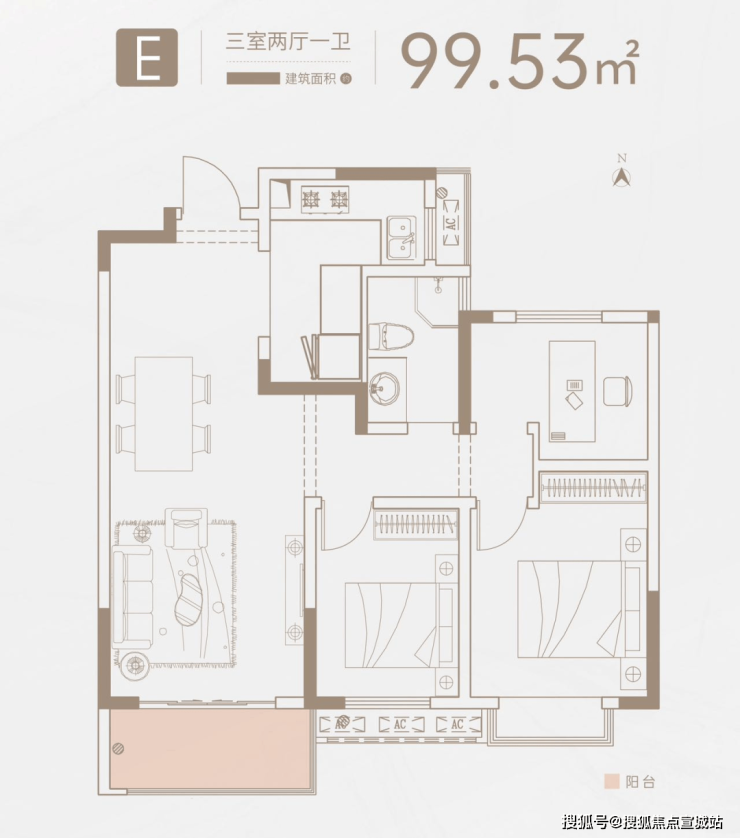 户型设计紧凑、格局方正,最大的特点就是三个开间朝南,主卧、次卧、客厅朝南,客厅外超大阳台,主卧室人性化飘窗设计,可以尽享阳光的滋润。