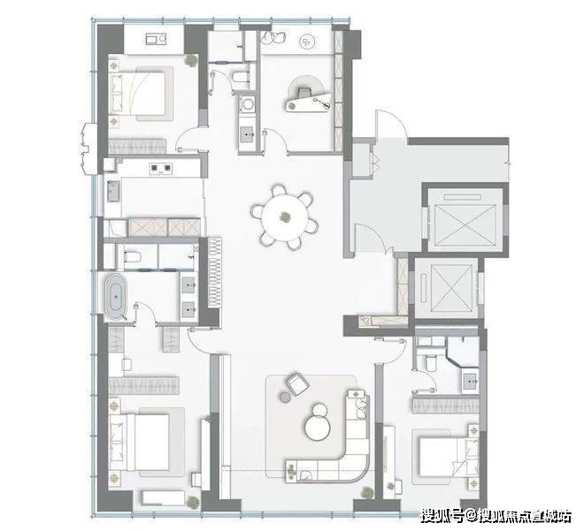 建面约249㎡户型,四房两厅三卫设计,颠覆了超高层住宅普遍低得房率的传统观念,实现了约79%的高得房率!