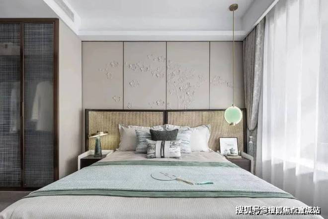 走进主卧空间,更见一派清雅之美。石膏皮雕式的床头背景墙,将梅花以立体化的形式展现,赋予空间更多的画意感。