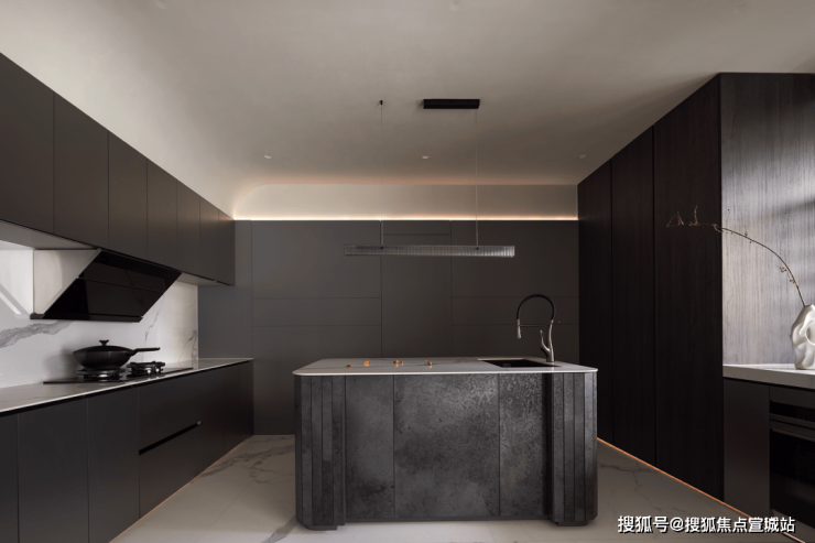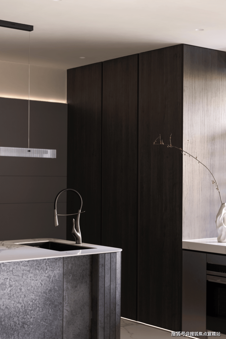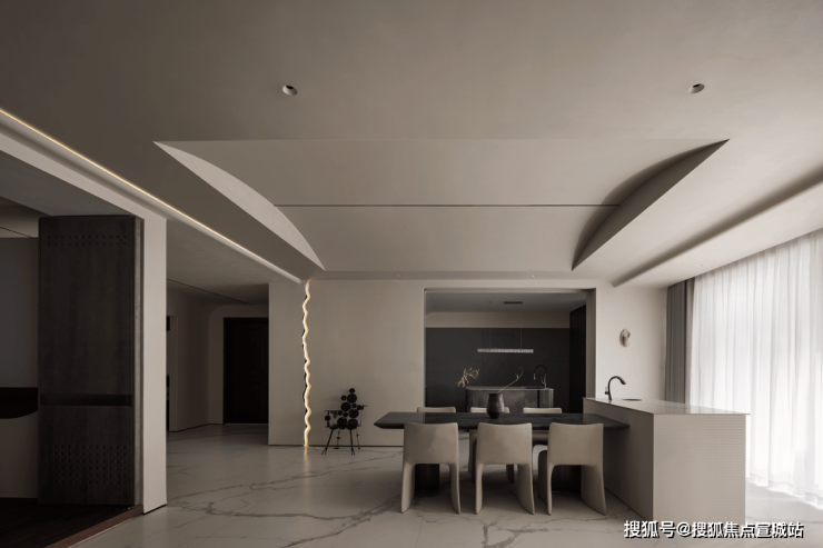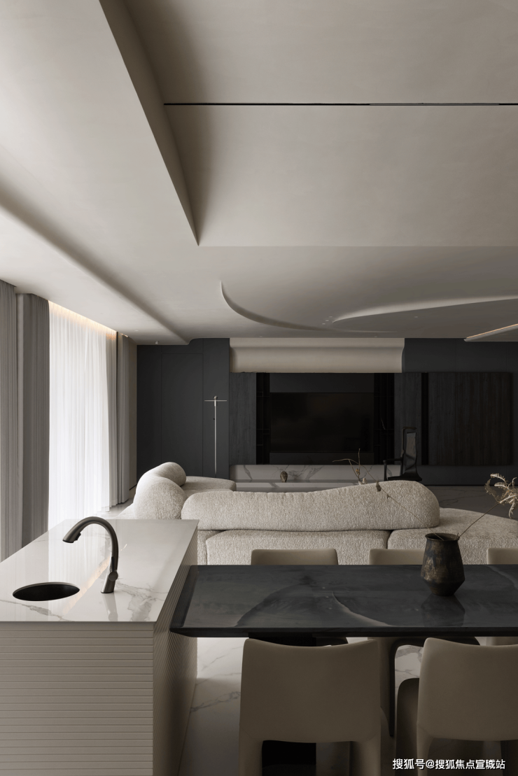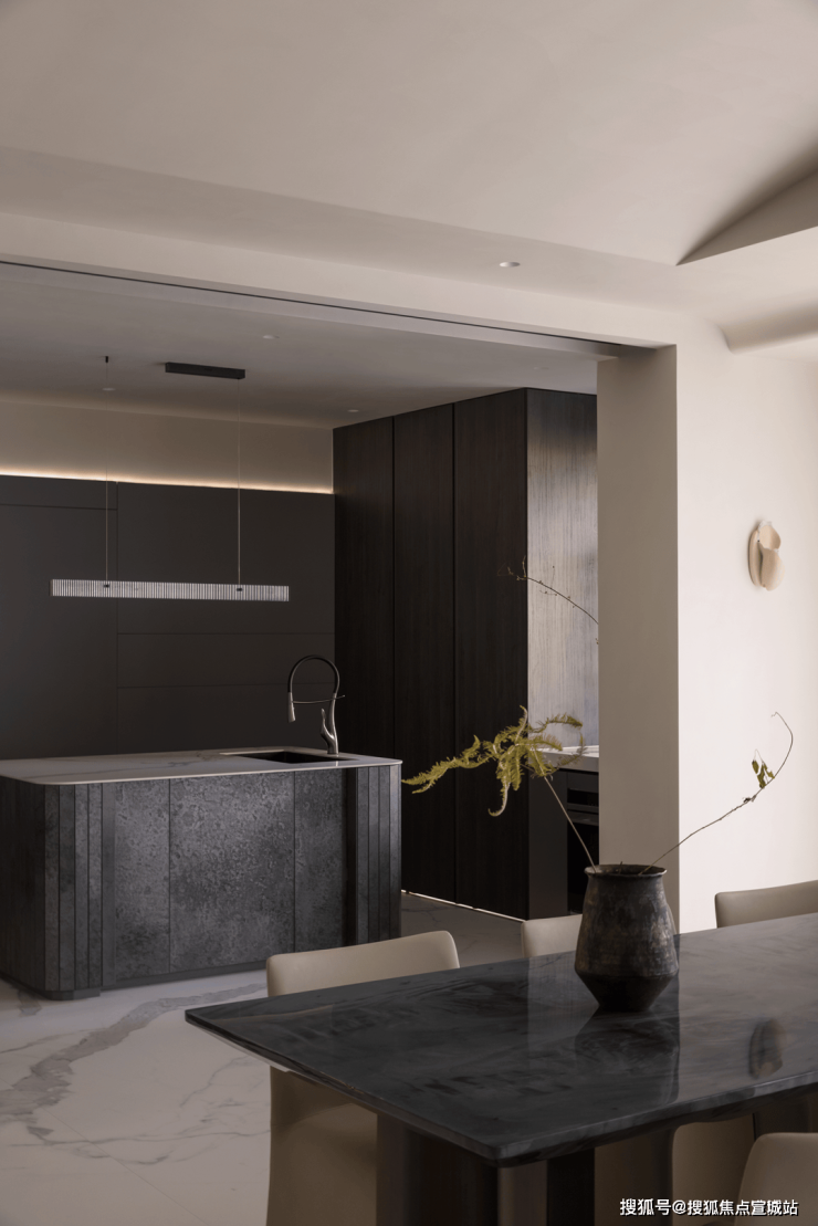 开放式布局,竖向的延展,拉伸了整个空间的尺度,体感上的通透给予生活更广阔的视野,当屋外的日光透过白纱,在纯净的氛围中糅入生活的气息,居者将更能感受饮食时光的美好温度.
