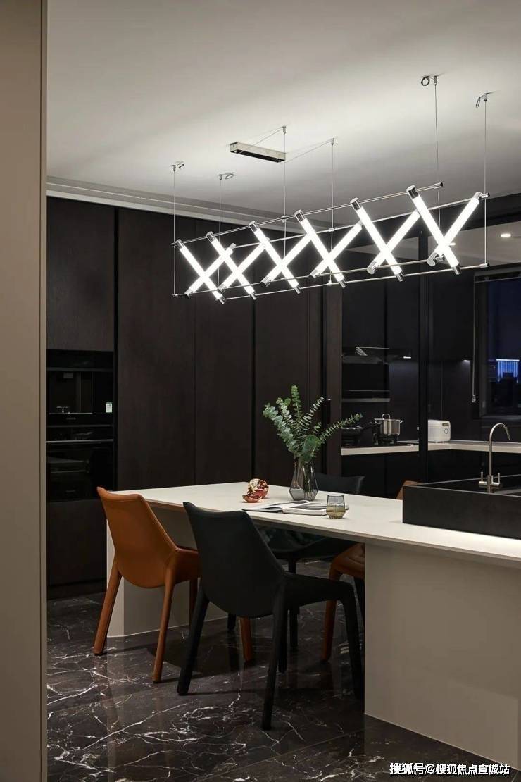 与客厅相比,餐厅对黑色的运用更为多元.设计师巧妙地运用不同材质,吊灯与精致器皿相得益彰,一幅城市墨画定格了时间,伴随着富有格调的三餐四季.