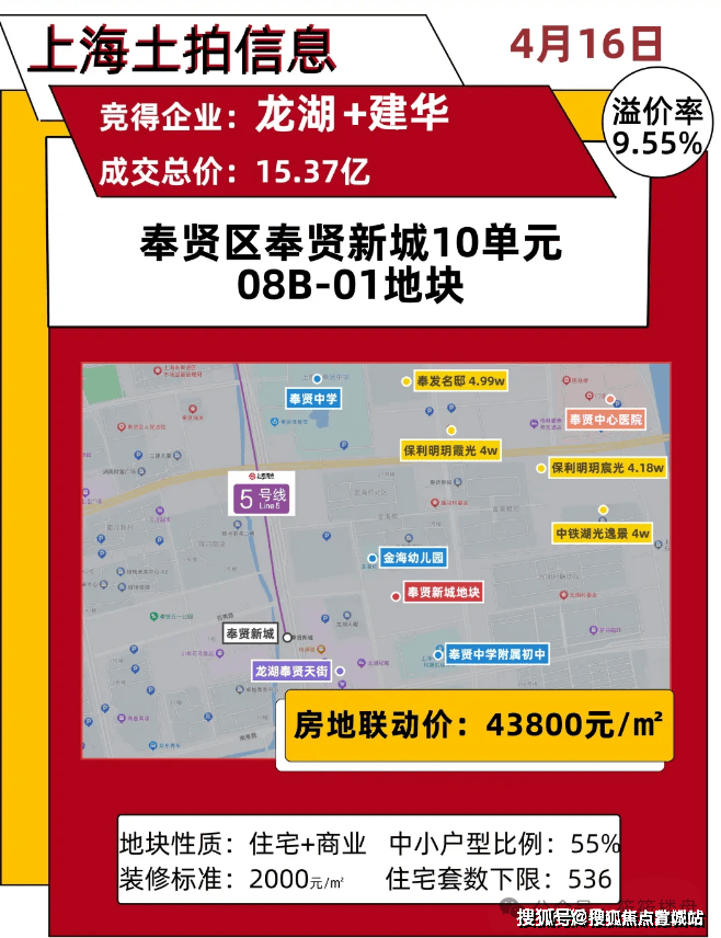 2024年4月16日,上海第一批次土拍,龙湖+建华联合体以15.3731亿元竞得上海奉贤区奉贤新城10单元08B-01地块,成交楼面价18360元/平方米,溢价率9.55%,房地联动价4.38万元/平方米。