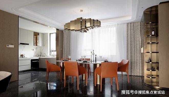 圆润如鹅卵石的餐桌造型独特,搭配橙色复古餐椅与黄铜吊灯,暖色调的碰撞让用餐氛围温馨而高级。