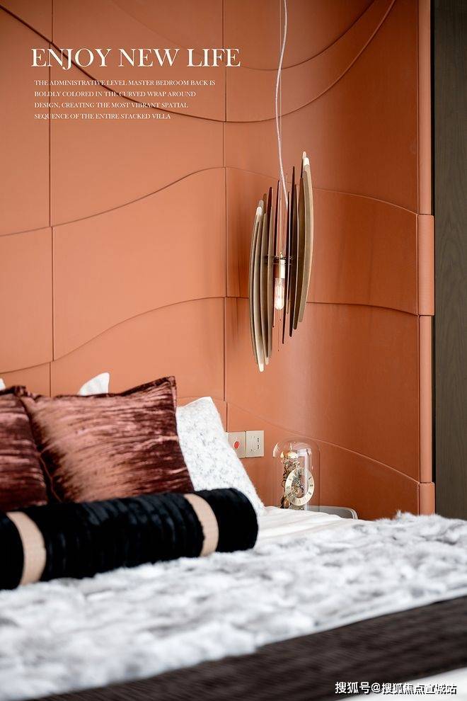 主卧延续公区的自然基调,床头背景墙以浅木纹与石材拼接,搭配一株室内绿植,将户外景致引入室内。