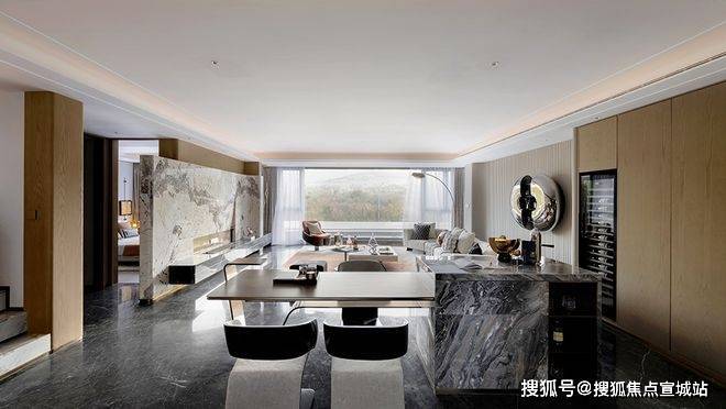 客厅与餐厅以开放式岛台衔接,形成“家庭核心区”。岛台不仅是操作台,更成为家人互动的纽带——备餐时抬头可见窗外景致,阳光与笑声在此交织。