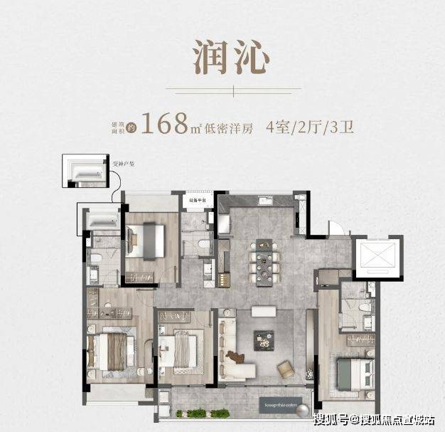 169㎡户型较为方正,双套房,四开间朝南,南向面宽约15.2米。LDKB一体设计,客厅开间约5.2米,双联阳台开间约8.3米。 ✨✨苏州澜庭湾售楼处电话:400-8123-224✔✔✔☎☎