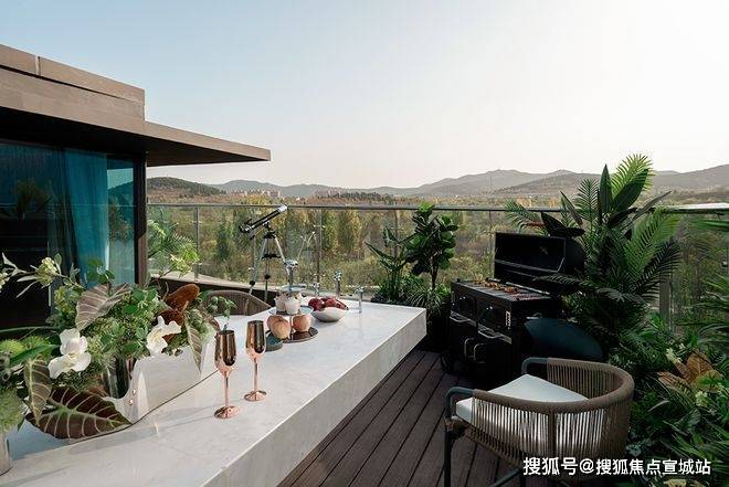 二楼露台以绿植为幕,打造出城市中的“微型森林”。木质地板与铁艺围栏的组合粗犷而自然,搭配户外沙发与茶几,成为家庭咖啡馆或深夜酒会的绝佳场地。