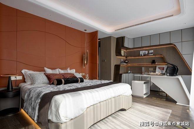 次卧以弧形床头柜与圆形梳妆镜打破直角僵化,粉灰色调搭配绒面材质,营造出柔和的包裹感。