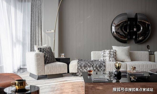隐藏彩蛋:沙发墙内嵌的银灰色酒柜暗藏玄机——70块金属板以极简拼缝工艺排列,开合间如艺术装置般点亮空间,既满足收纳需求,又成为公区的视觉焦点。