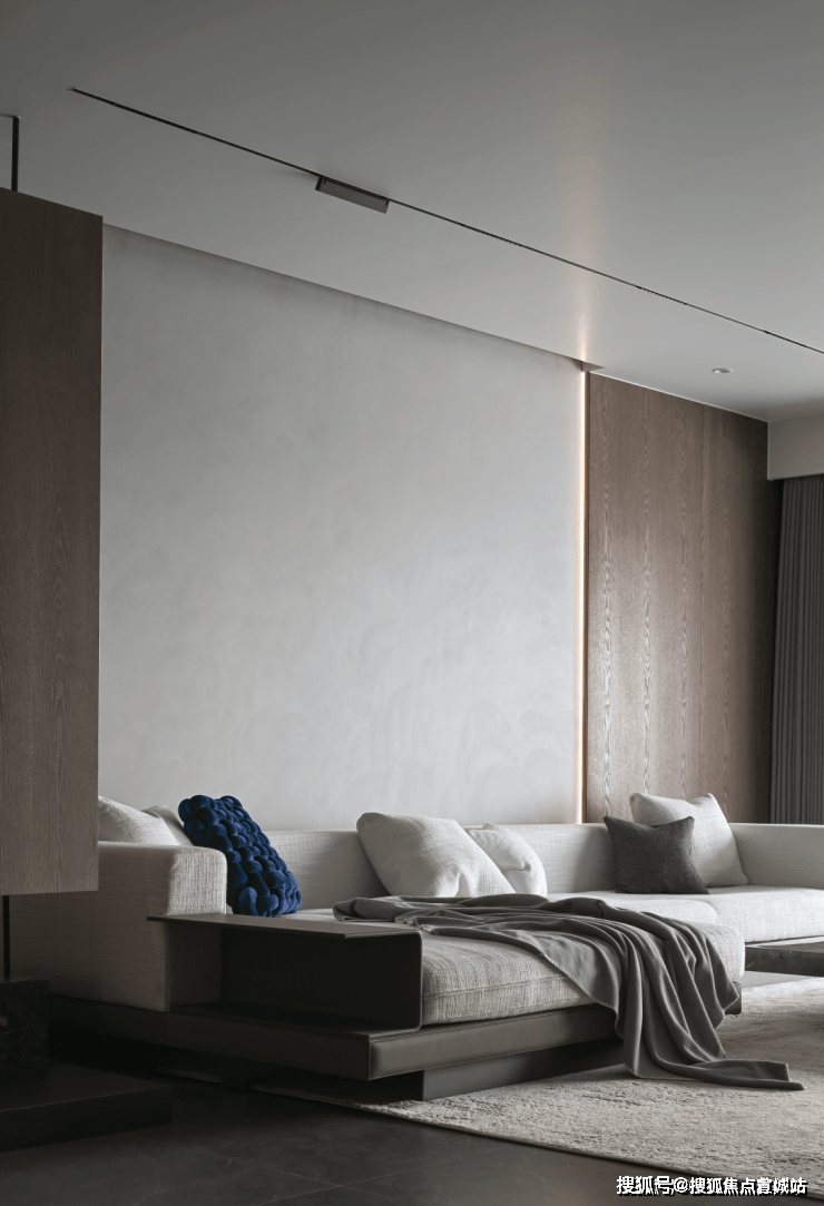 克制的材质使用和通顶的隐形门让走廊维持着外在的简约,格栅的肌理和大理石的纹路交织,悬挑和挖空带来错落的结构感,都丰富着空间的细节和层次.
