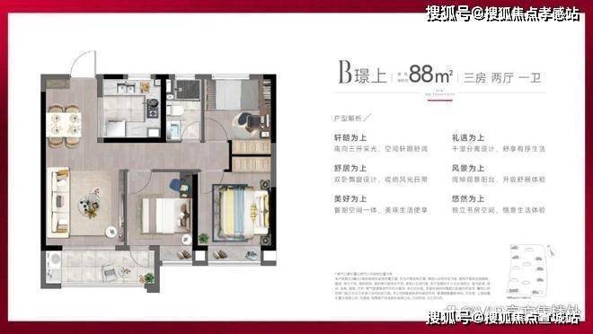 建面约88㎡3房2厅1卫户型,做到了三开间朝南+双朝南卧室带飘窗+动静分离,采光面拉到极致的小3房。
