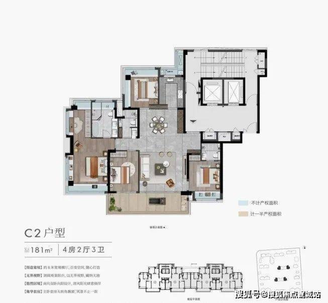 建面约143㎡则是经典的改善户型设计,四开间朝南,大横厅+大面宽,兼具舒适度。