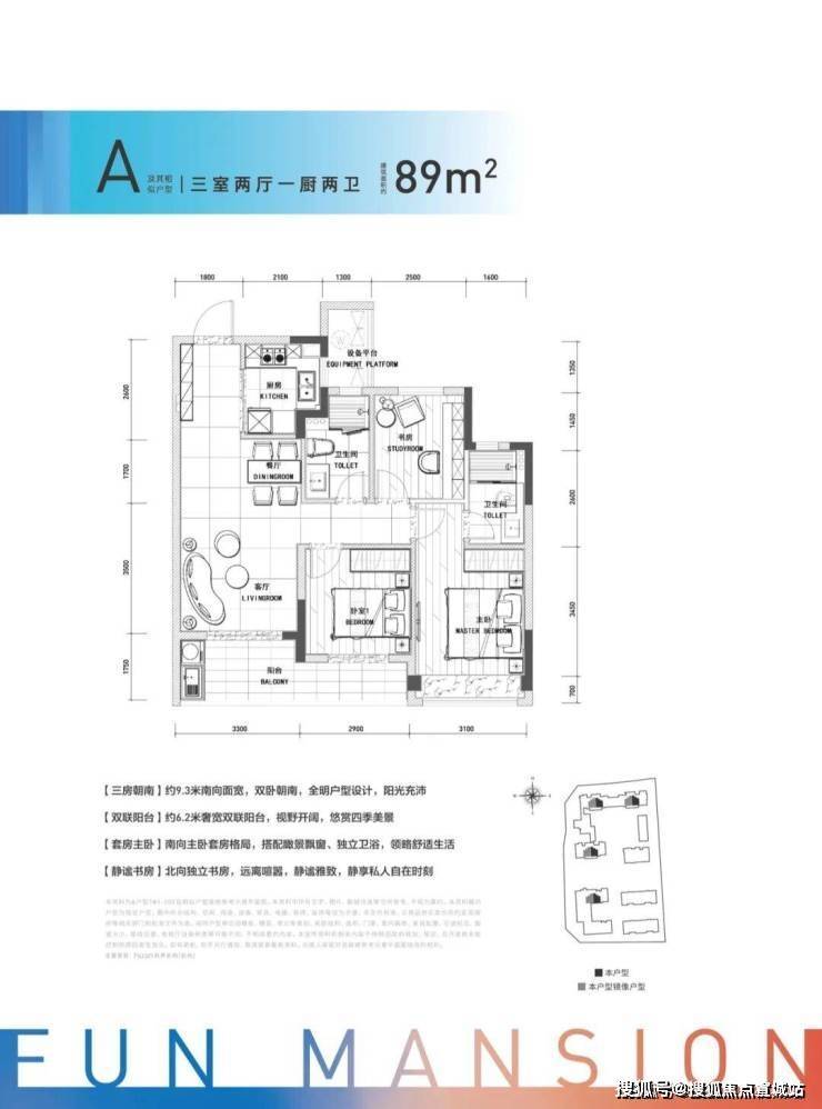 比如89方的中间套三房两卫户型采用了L形的大小双联阳台,既舒适又实用。105方的边套三房两卫户型,边厅的宽度达到了7.1米,南侧预留了放钢琴或者敞开式书房的位置。