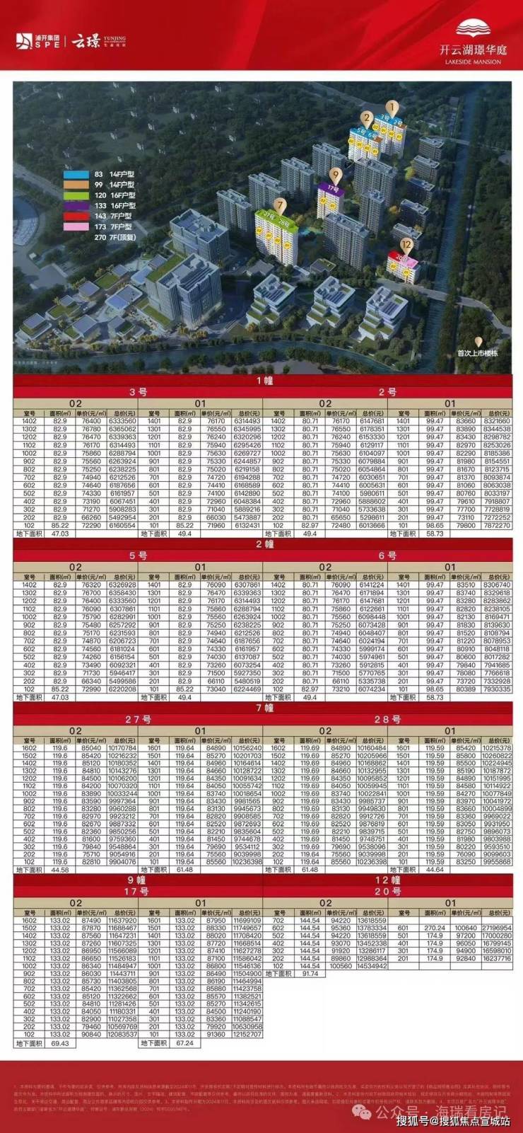 高层有约83平、约99平、约120平、约133平四种户型,洋房有约143平、约175平,另外还有少量几套的约270平顶复户型。
