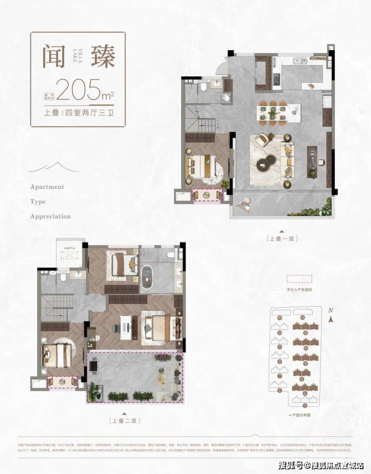 上叠:建面约205㎡,四房两厅三卫(赠送22㎡露台)
