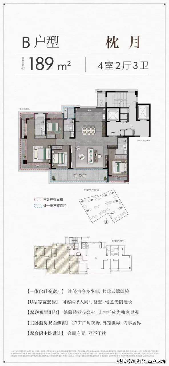 189㎡:四室两厅三卫,有 60㎡宽厅和 270° 观景阳台,总价约 520 万。