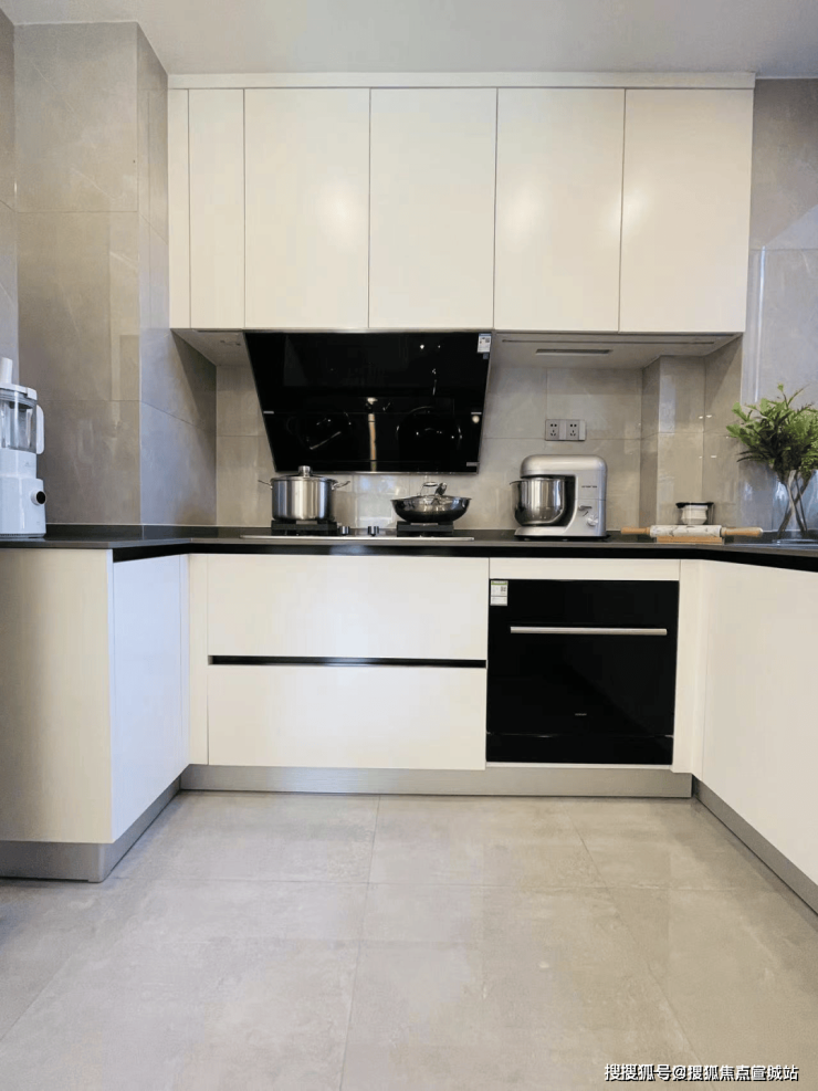 厨房采用了老板油烟机、灶台、洗碗机,海德泰克净水器,松下凉霸,厨柜组合。