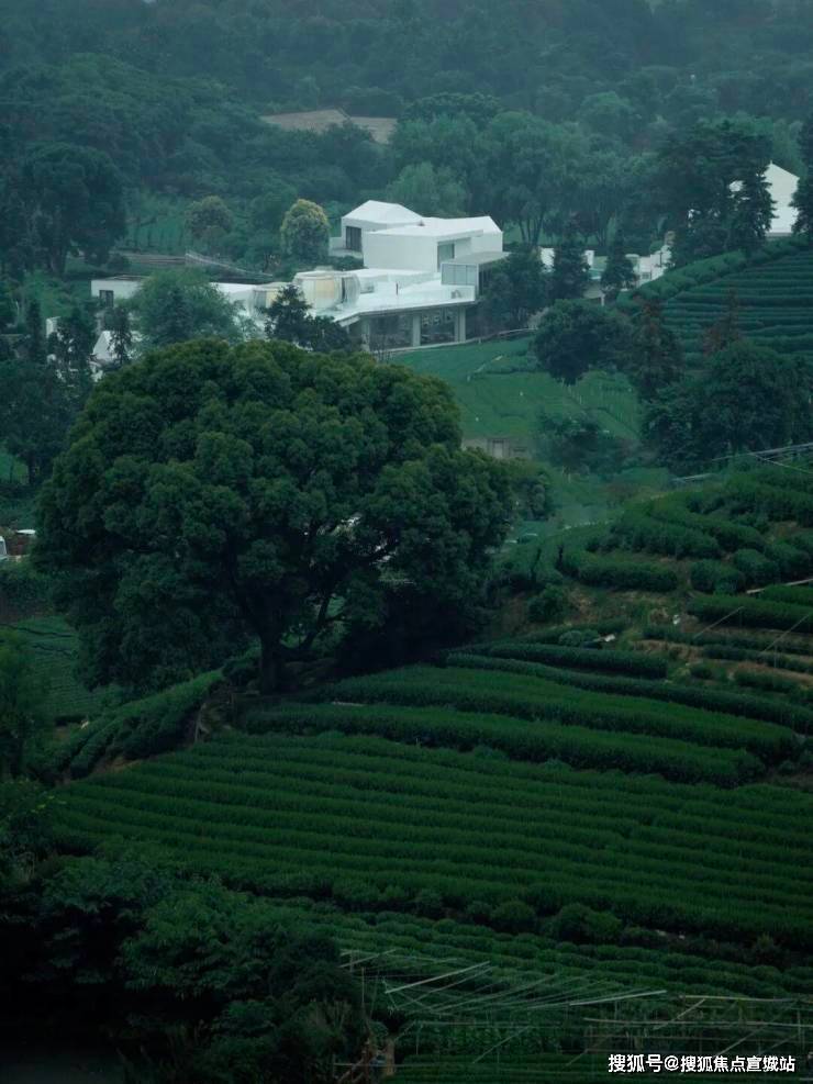 大坡顶+小坡顶结合,与台地呼应。再将茶山的脉络线条镶嵌在屋檐上,屋面采用瓦片材质与金属钩边铺装,青瓦交叠,蕴藉着江南诗意。