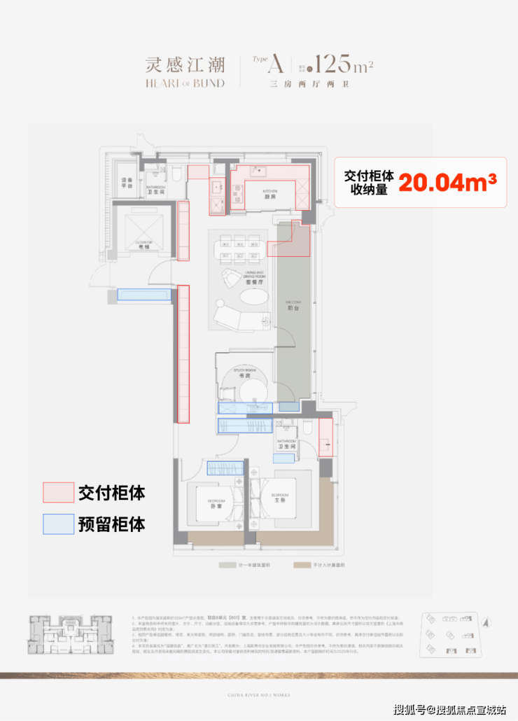 据小胖君手工统计,项目125㎡3房边套户型的整体交付柜子+预留衣柜,收纳空间可以达到约20.04m³,中间套户型也能达到约16.56m³!