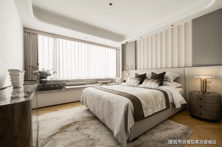 主卧聚焦居住者心里层面的私密感受。将不必要的元素剔除,留下简柔色块,柔和的光线和质感细腻的材质,使整个卧室显得温馨而舒适。床前的绿植和窗边的阅读角,为居住者提供了一个放松心灵的角落。