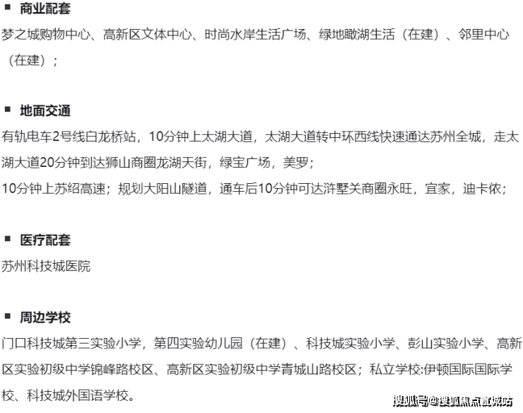 周边配套:商业配套有梦之城购物中心、高新区文体中心、时尚水岸生活广场等;医疗方面有苏州科技城医院(三甲医院);教育资源有科技城实验小学(天佑校区)和新区实验初中锦峰路校区等,周边还覆盖从幼儿园到大学的全年龄段教育资源,包括伊顿国际学校、科技城外国语学校等。