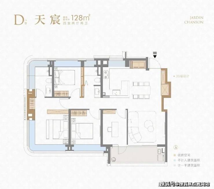 项目建面约128㎡4房户型延续了前作3S墙的设计,保证了收纳空间的丰富性。