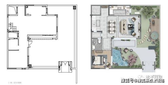 「贴线率」一高,院子的视觉面积就会被放大不少。想象一下,从厨房可以看到院子,穿过客厅能看到另一面院子,走到房间又是另一个角度的院子……是不是比平铺直叙一览无余的直线,要有意思一些?