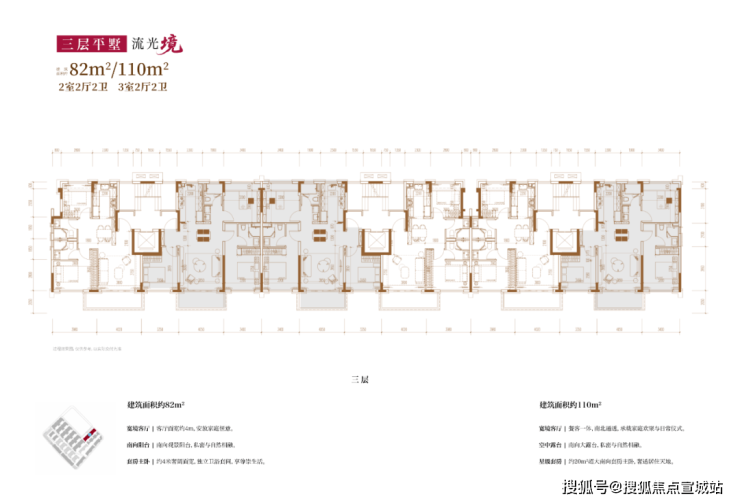 建面约82㎡2房2厅2卫/110㎡3房2厅2卫(三层上叠):
