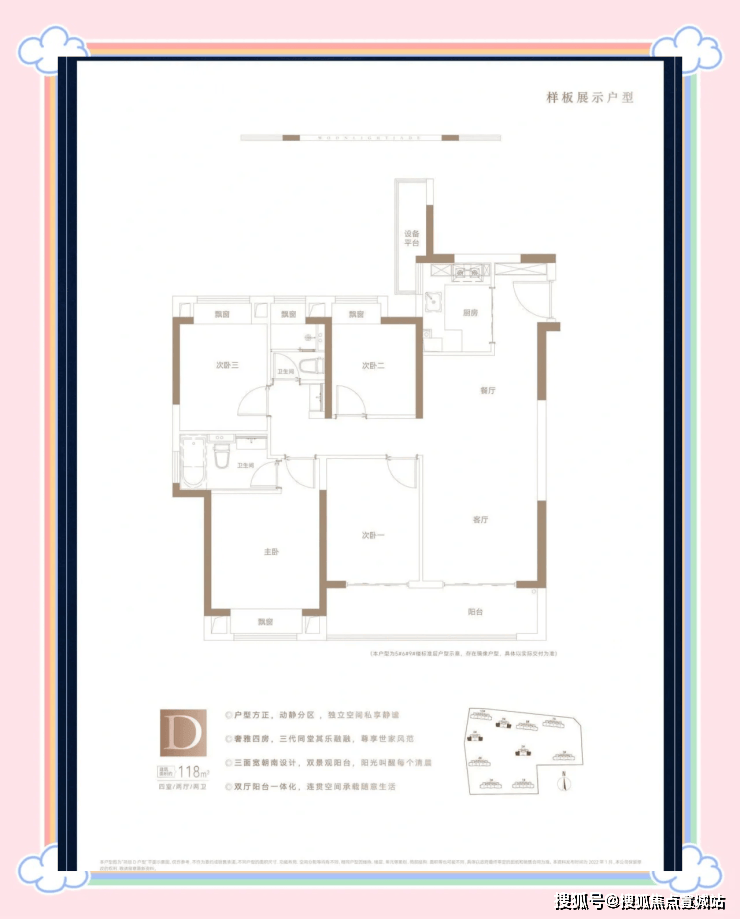 主力户型:为建面约 88㎡三房、98㎡三房及 118㎡四房。