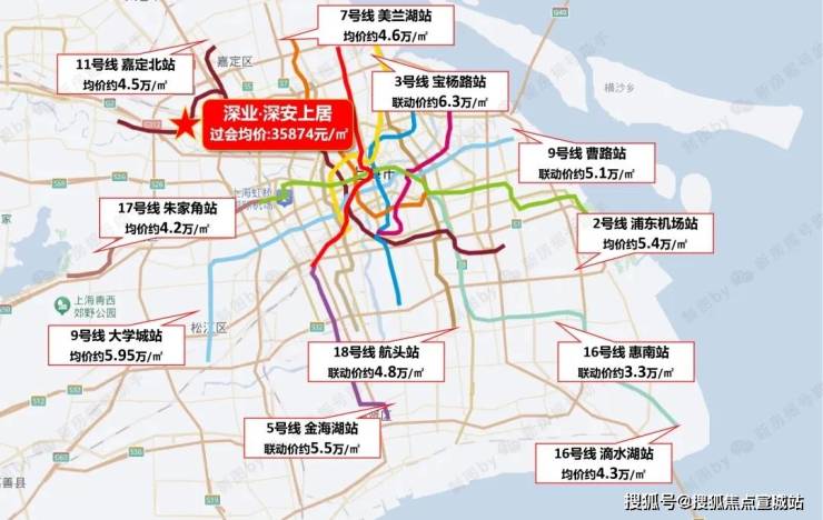 同样处于嘉定区,仅两站之隔的深业·深安上居的过会均价35874元/m²,相较于前者低了近1.5万/m²。