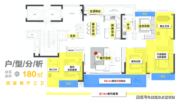 建面约180㎡的终极改善户型为4房2厅3卫的设计,五开间朝南,南向开间达到了惊人的近18m;