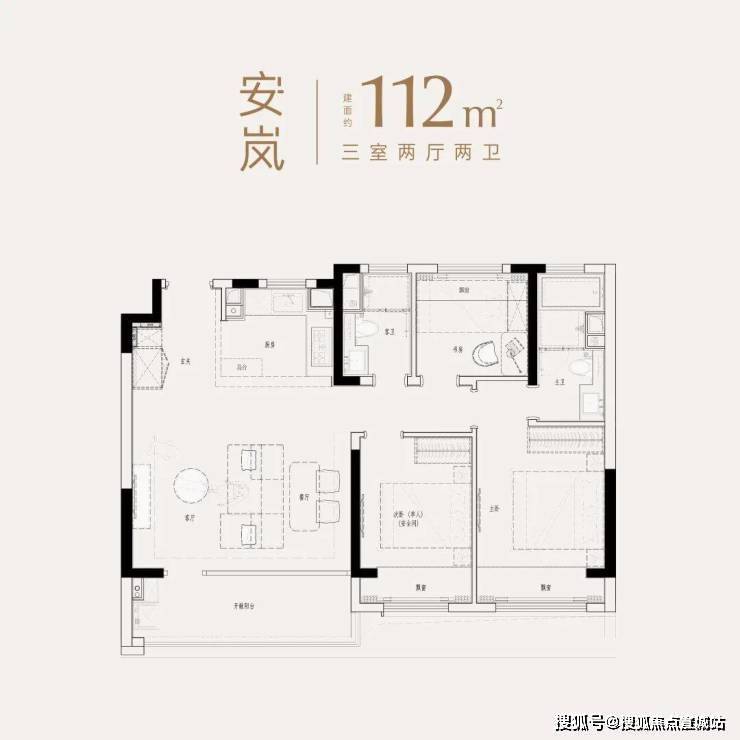 112㎡三房两厅两卫:三开间朝南,餐客厅一体化搭配等宽开敞阳台,采光通风佳;主卧为套房设计带独立卫浴,适合首置和初改客群,总价 230 万起。